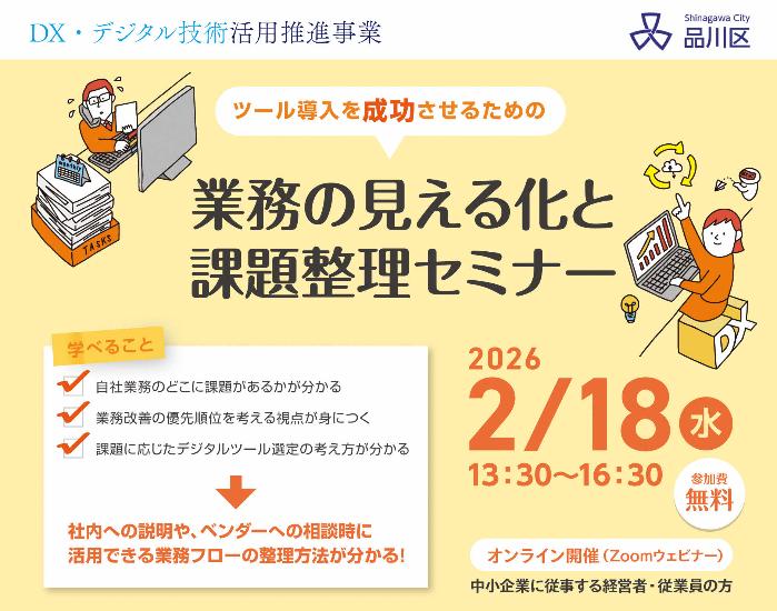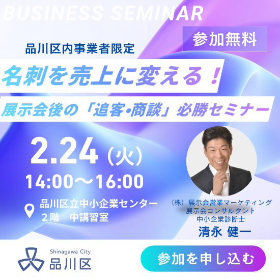 【DX・デジタル技術活用推進事業】業務の見える化と課題整理セミナー参加募集中! 令和8年度助成制度等説明会参加募集中! ”新規事業の進め方” 短時間解説動画を配信中!! 品川ソーシャルイノベーションアクセラレーター開催! 事業承継オンライン講座(第三者スカウト型承継、M&A)配信中 SHIP 品川産業支援交流施設 新着情報 新着情報はございません。 新着情報一覧へ RSS 目的から探す 資金調達したい 助成金を申請したい 取引先・ネットワークを 広げたい 様々な相談がしたい ブランド価値を高めたい 起業・創業したい 従業員を 採用したい スキルアップを図りたい 事業承継をしたい 譲渡をしたい 情報通信技術を 活用したい 地域産業振興課 リリース 2025年07月14日 第30回機械要素技術展(東京) 品川パビリオンに区内企業が出展 2025年04月25日 「中小企業が今取り組むべきDXの第一歩」が開催されました。 2025年04月24日 東京商工会議所品川支部と産業振興に関する協定を締結 2024年12月06日 「SHINAGAWAイノベーションフォーラム2024in五反田バレー」を開催しました 2024年11月22日 6区1市1県合同 令和6年度 品川区 ものづくり・IT商談会を開催 2024年10月11日 第27回機械要素技術展(大阪)品川パビリオンに区内企業が出展 2024年03月16日 五反田バレーアクセラレーションプログラム「Demo-Day」 2024年02月19日 ウーマンズビジネスグランプリ2024 in 品川 開催 2023年11月01日 「SHINAGAWAイノベーションフォーラム2023in五反田バレー」を開催しました 2023年03月01日 信金中央金庫より寄附金を受領 2023年01月30日 「羽ばたけ!☆アントレーヌ in 品川 Vol.15」を開催 2022年08月05日 しながわ新規事業創出(事業共創)プログラム2022キックオフ メードイン品川ブランド 認定製品 事業者向けサービス マイページ作成 こちらからあなたの会社の紹介ページを作成できます。 マイページ作成 メールマガジン 月に1~2回ほど、地域産業振興課からのお知らせを配信しています。 登録・解約 イベントカレンダー イベント情報をカレンダーで紹介しています。 カレンダー詳細 企業検索 業種から探す 企業名から探す 条件から探す 業種から探す 業種から企業を検索します。 業種 指定なし キーワード 企業名から探す 企業名から企業を検索します。 50音から探す 指定なし キーワード 条件から探す 条件を選択・入力してください。 業種 指定なし 従業員数 資本金 ISO認証 キーワード 関連リンク