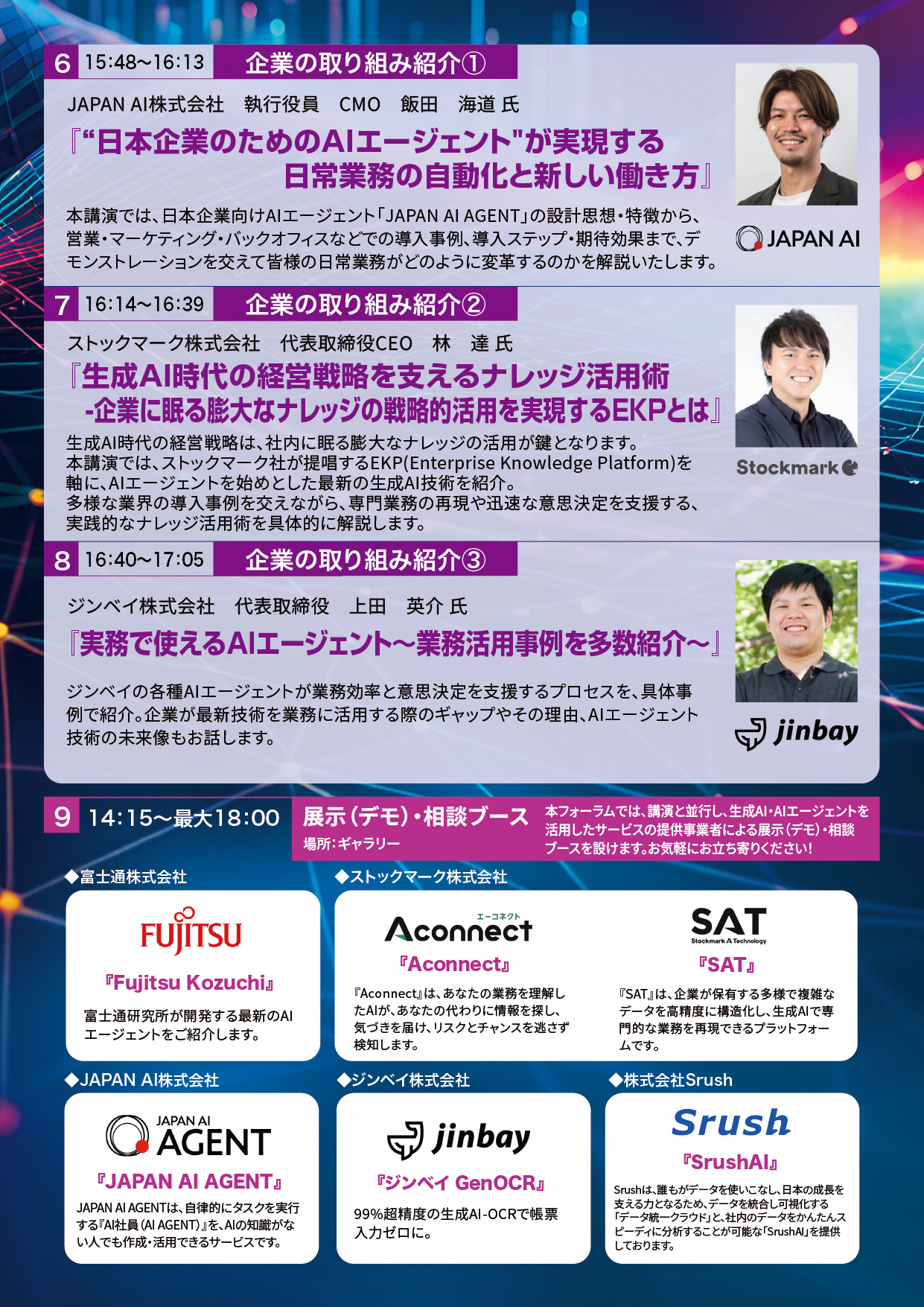 本フォーラムでは、生成AI・AIエージェントの最新動向と先進事例をご紹介し、中小企業のイノベーション創出やネットワーク形成のきっかけを提供します。